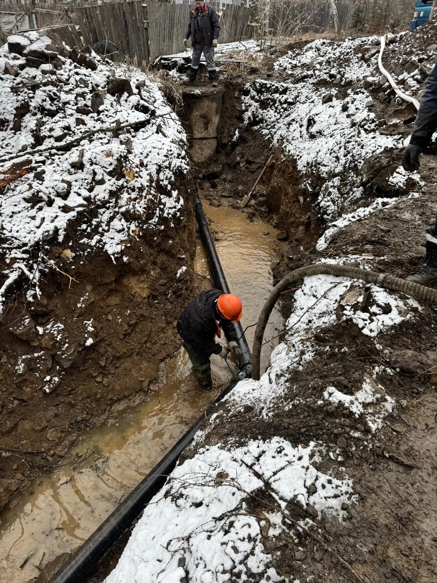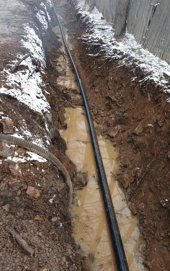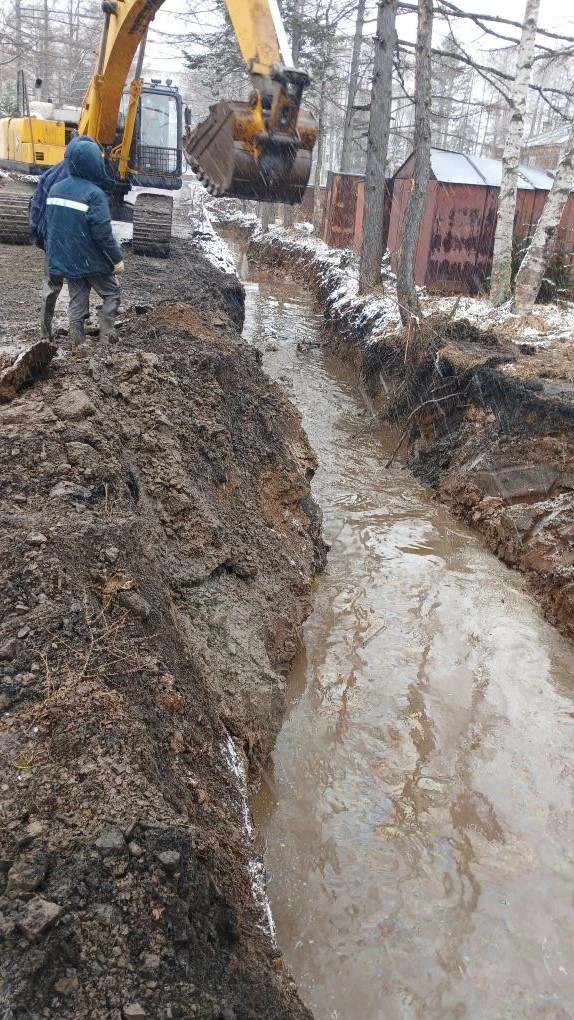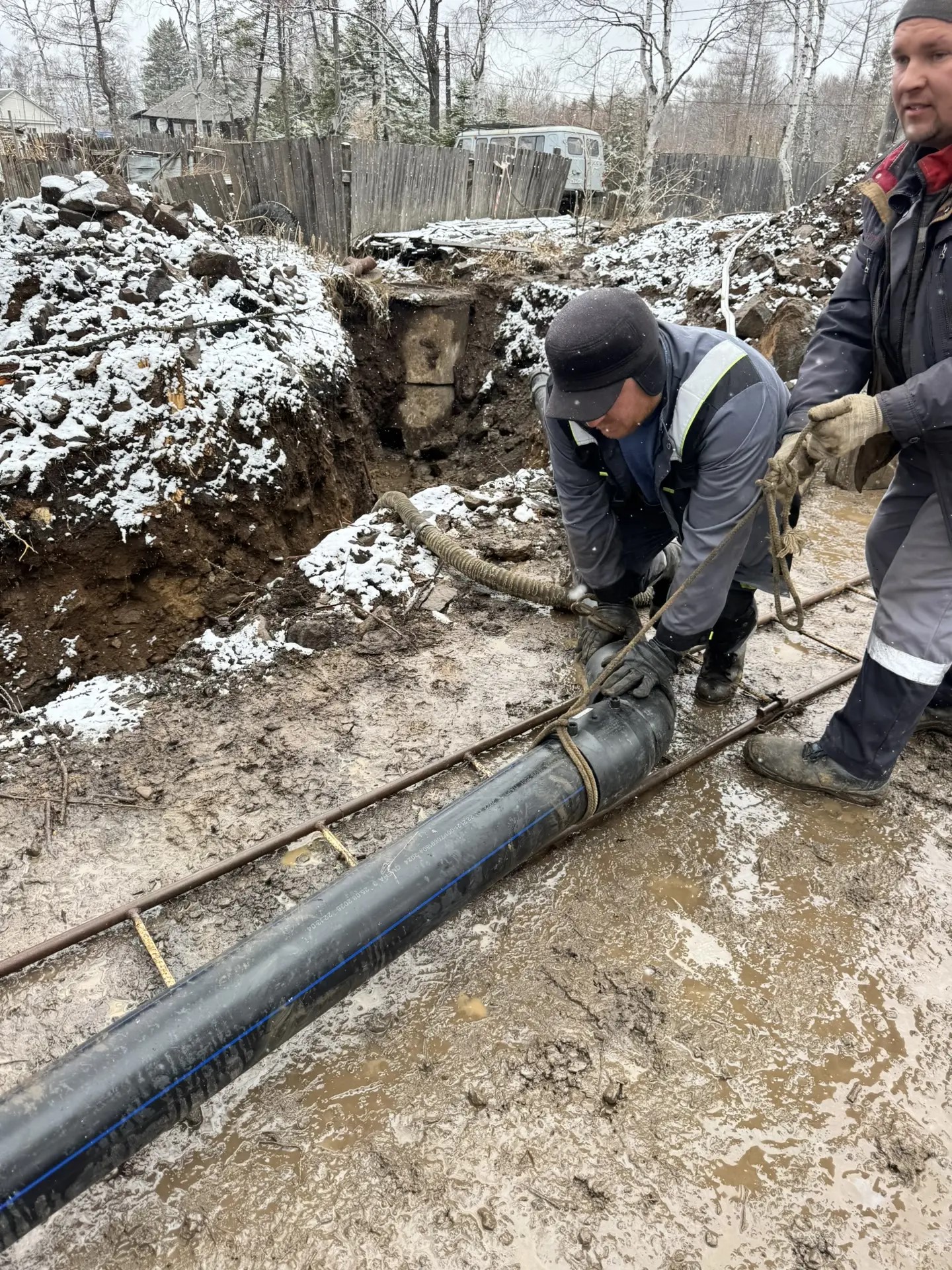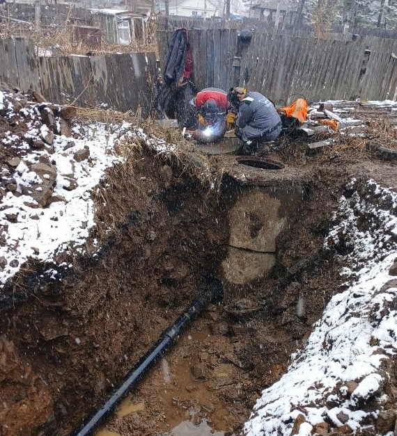 Сейчас на участке ведутся финальные работы по прокладке нового трубопровода. Специалисты выполняют завершающие сварочные соединения, обеспечивая полную герметичность и надежность будущей системы водоснабжения.